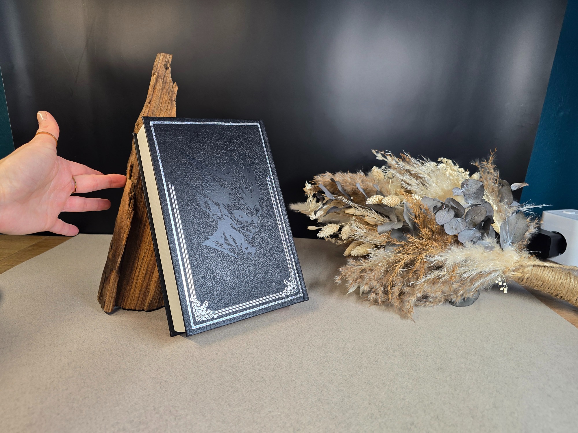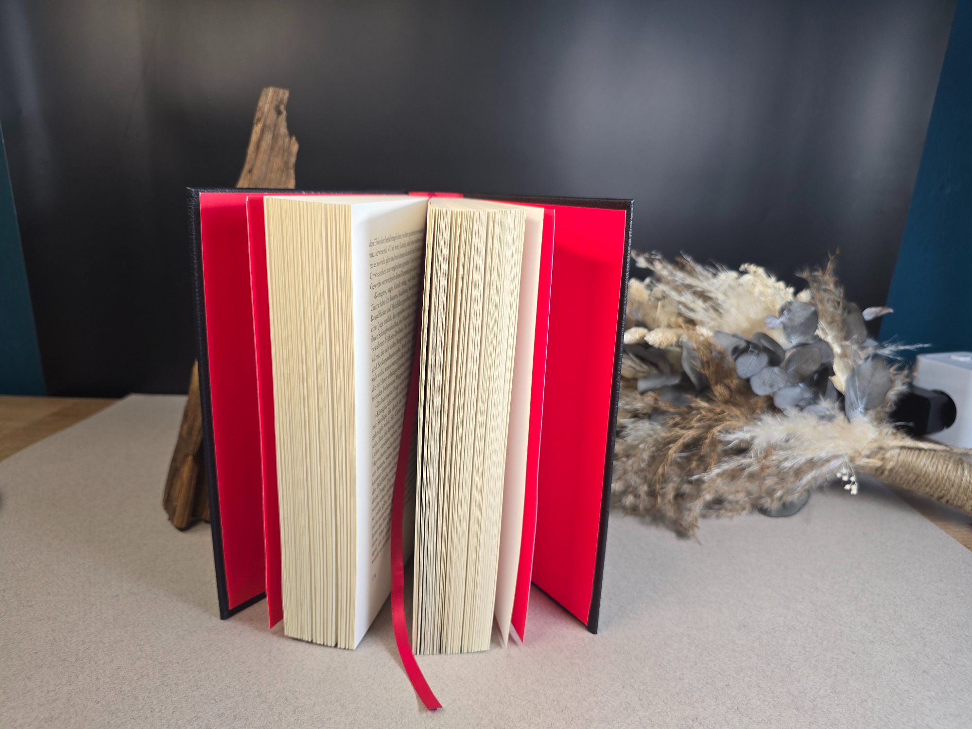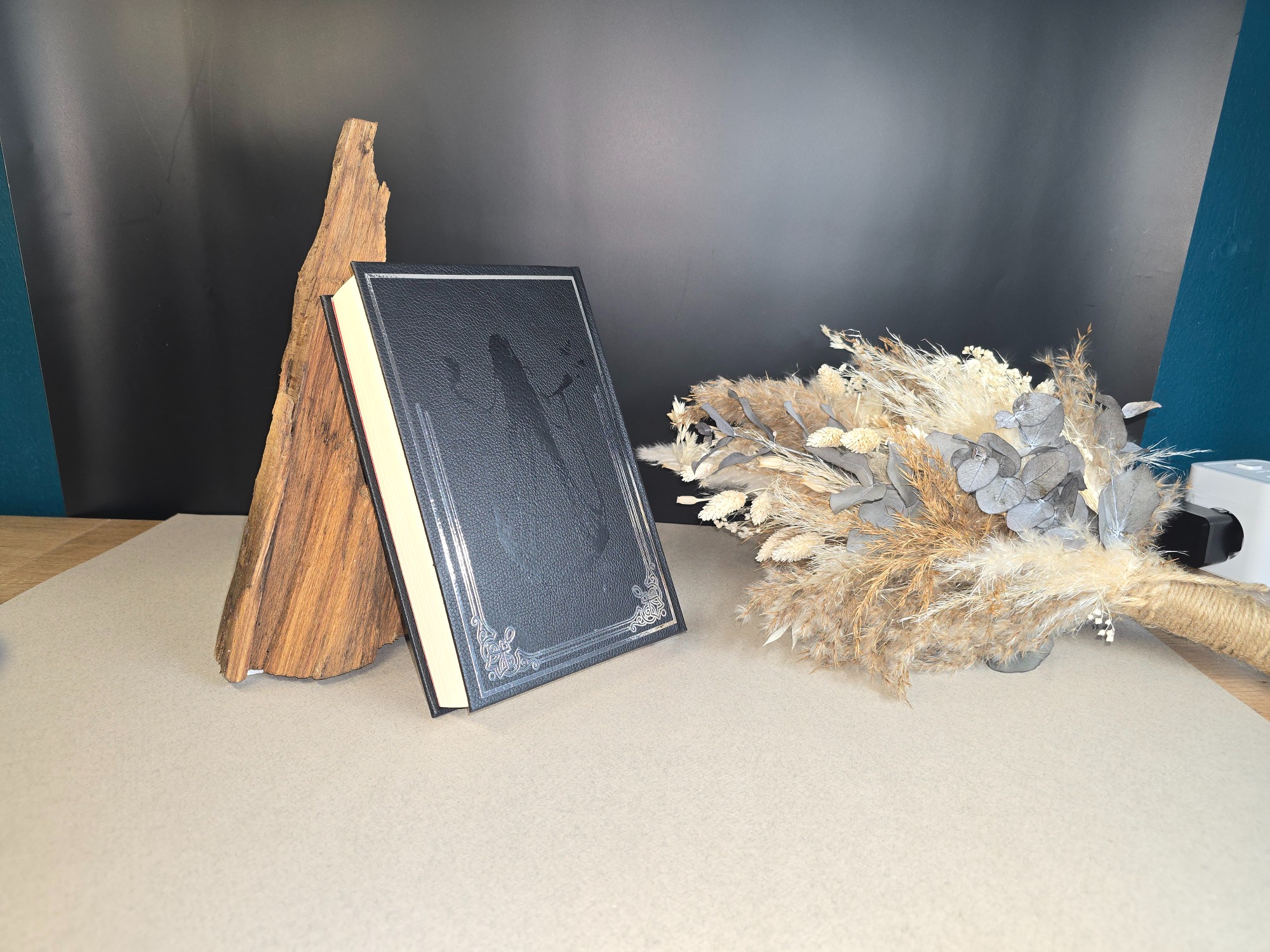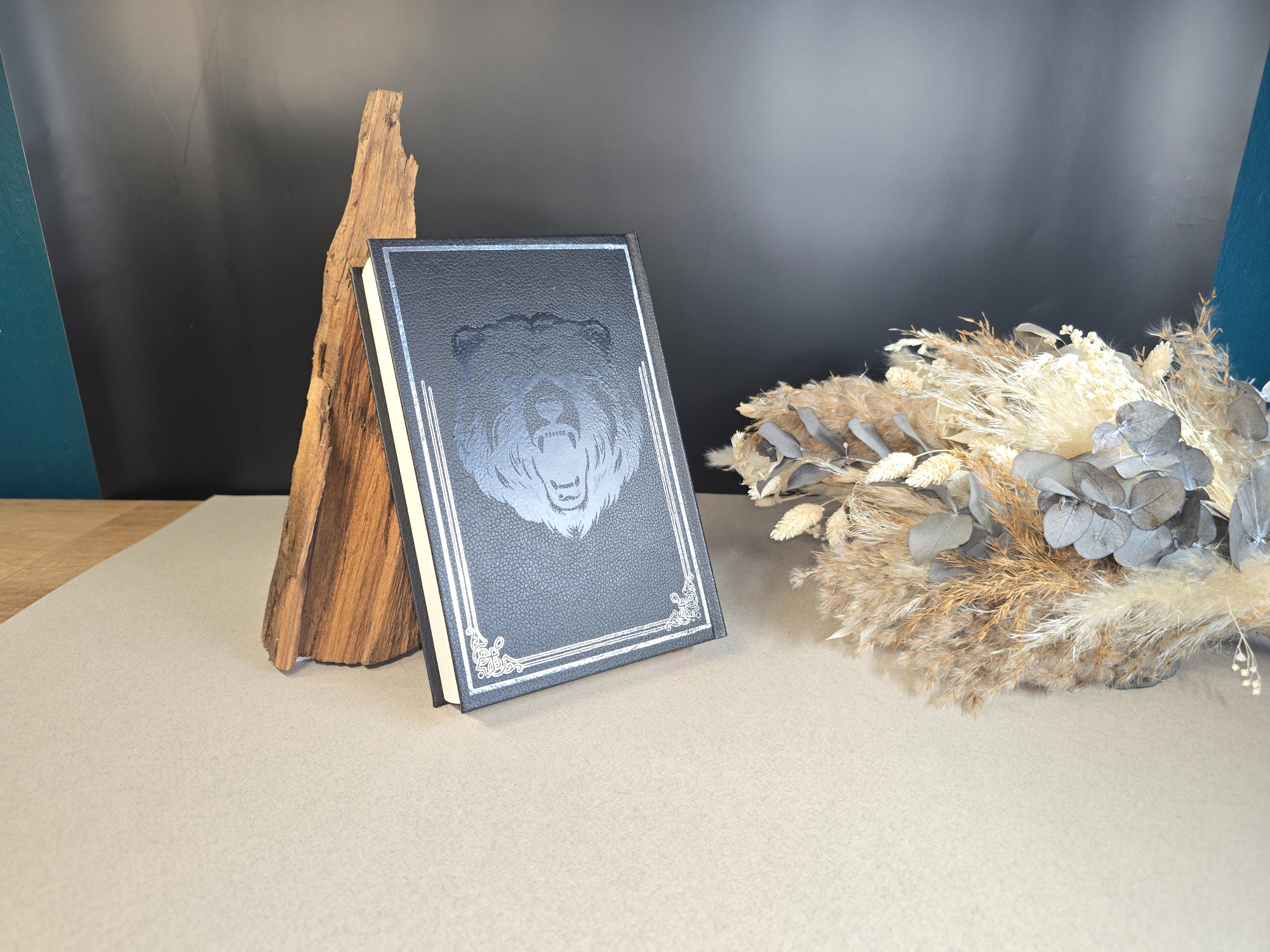 - Veredelung: silberne HTV-Folie auf Vorder- und Rückseite sowie auf dem Buchrücken, schwarze HTV-Folie auf der Rückseite und rote HTV-Folie auf dem Buchrücken