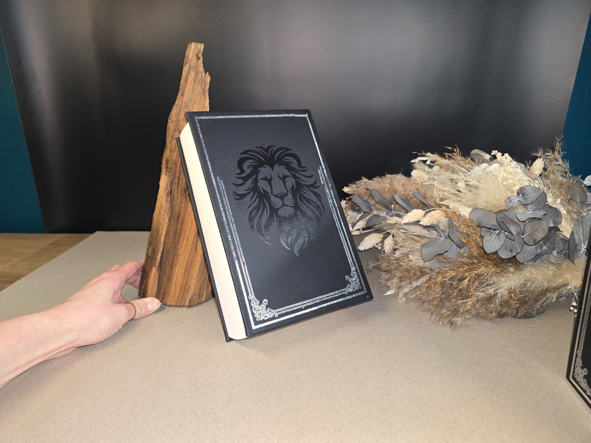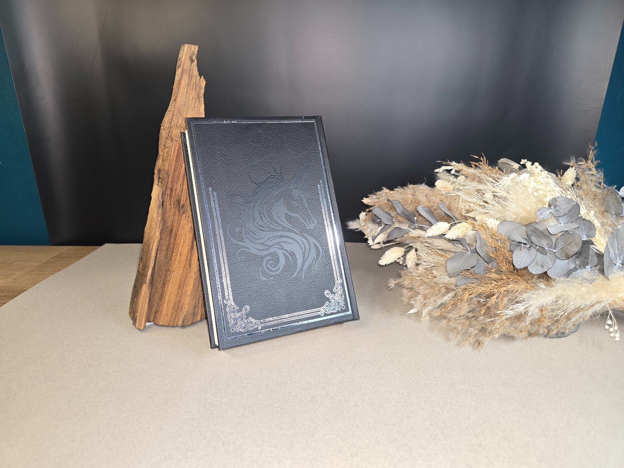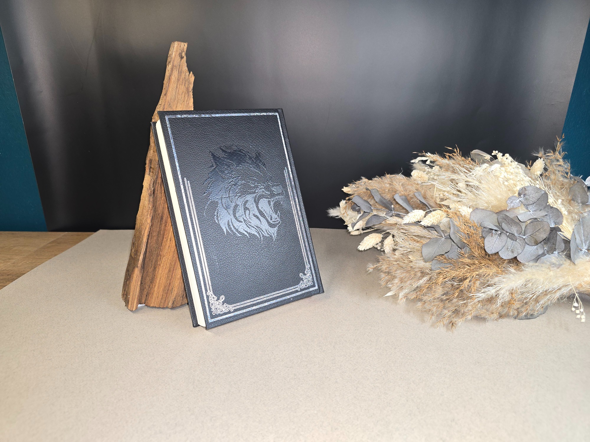 - Veredelung: silberne HTV-Folie auf Vorder- und Rückseite sowie auf dem Buchrücken, schwarze HTV-Folie auf der Rückseite und rote HTV-Folie auf dem Buchrücken