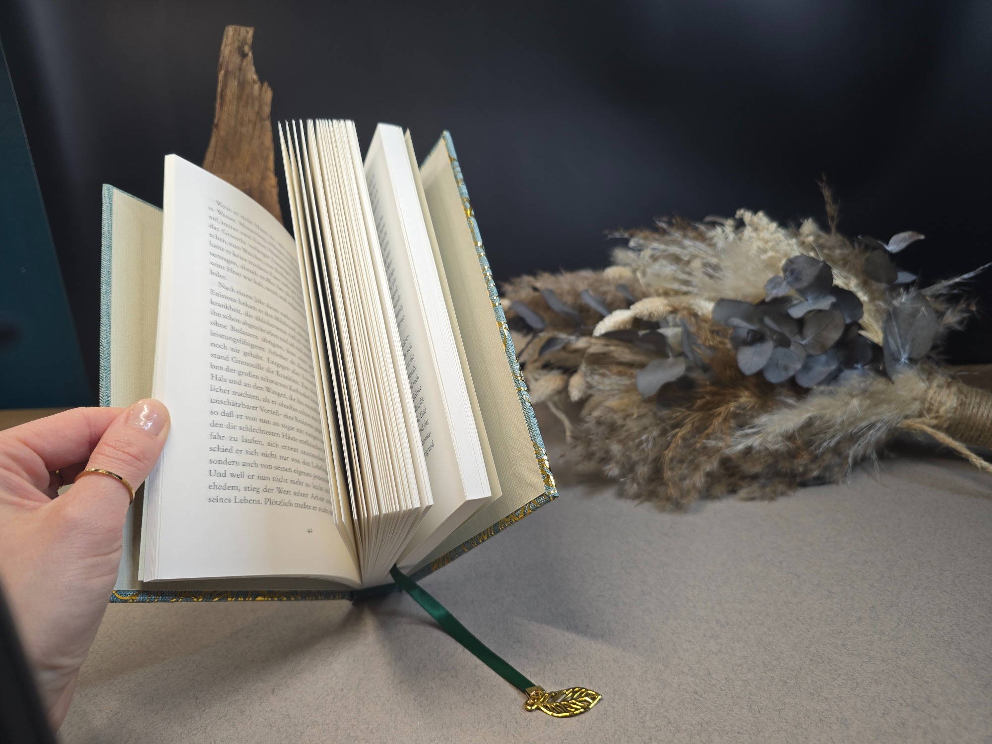 - Lesebändchen: 6 mm dunkelgrünes Satin sowie passendes Buchrückenband, wahlweise kann ein goldenes Blatt-Charms ergänzt werden.